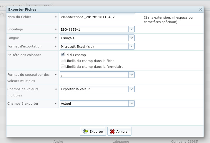 Si vous utilisez un logiciel d'analyse statistique, ou si vous souhaitez simplement conserver une copie des données associées à votre formulaire, l'exportation vous permet d'extraire le contenu des fiches, dans le format de votre choix.