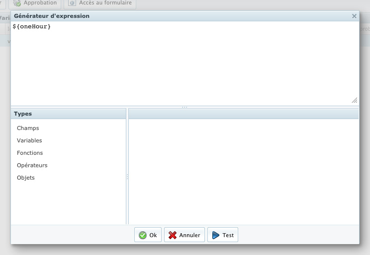 La création d'une variable est simplifiée par le constructeur qui vous permet des variables à l'aide d'un assistant. Chaque variable est composée de deux éléments : l'expression, et la condition. L'expression représente l'opération à effectuer sur la variable. L'action indique la condition à évaluer pour que l'expression soit validée.