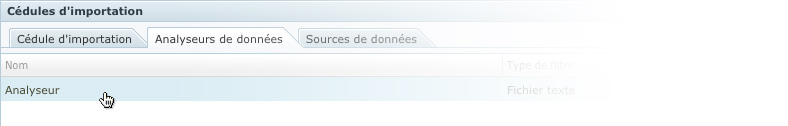 - Cliquez sur la source de données, l'analyseur de données, ou la cédule d'importation pour la sélectionner. La source de données, l'analyseur de données, ou la cédule d'importation sera surligné en bleu.
