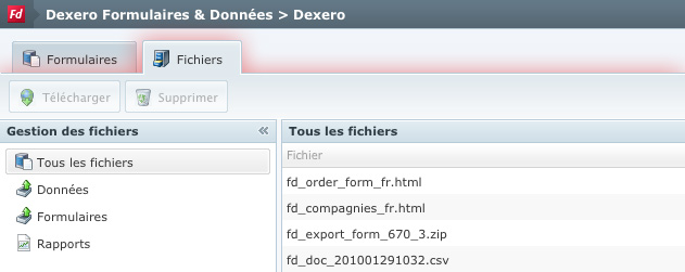 Lorsque vous exportez des données (fiches) ou un formulaire, ou lorsque vous générez un rapport, les fichiers produits sont accessibles par l'onglet Fichiers.