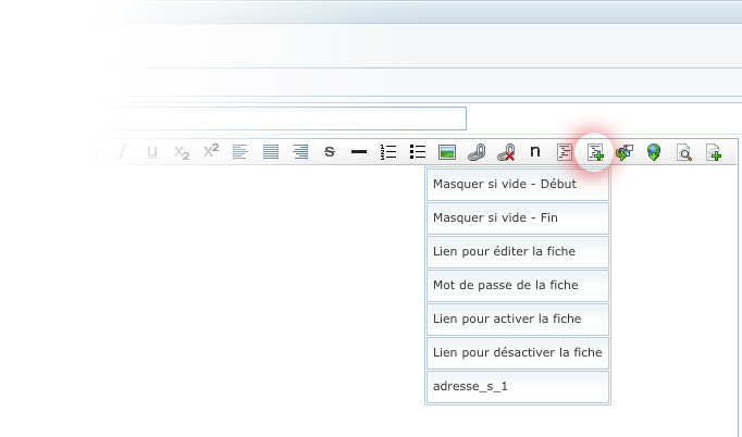 - Mot de passe de la fiche : Permet d'ajouter la balise qui sert à afficher le mot de passe pour accéder à la fiche.