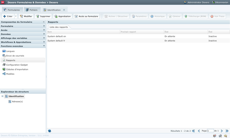 Dexero FD intègre la solution JasperReports pour la prise en charge de la génération des rapports. La préparation des gabarits de rapport, au format JRXML, se fait en utilisant le logiciel iReport