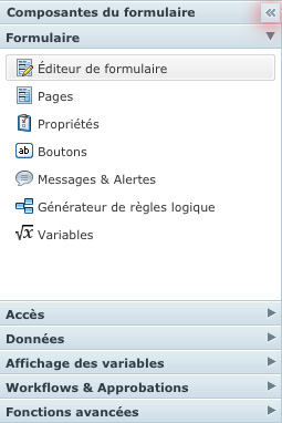 Ce volet contient des menus empilables, qui peuvent être ouverts ou fermés en cliquant sur les flèches. Lorsque vous ouvrez un menu empilable, le dernier menu ouvert se referme automatiquement.