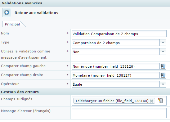 - Message d'erreur : Le champ Message d'erreur permet d'inscrire le contenu du message d'erreur qui s'affiche lors d'un échec de validation.