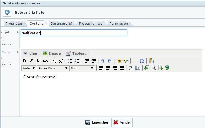 L'onglet Contenu permet d'éditer le contenu de la notification.